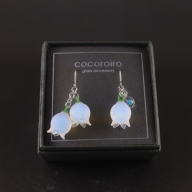 スズラン cocoroiro days 可愛らしいスズランの花のピアスになります。 サンドブラストをしているので、マットでふんわりした印象で日常使いにぴったりです。 花の色はゴースト。 オパリンのように乳白がかっており色合いが幻想的でとても綺麗になっております。 オパールをガラスに閉じ込めたパーツも一緒に組んでいるので、見る角度によってオパールの変化する色も楽しめます。 枯れないスズランのピアス、ぜひお迎えよろしくお願いします。 スズランサイズ:W10 ×H18 ×D10 (mm) *金具変更不可