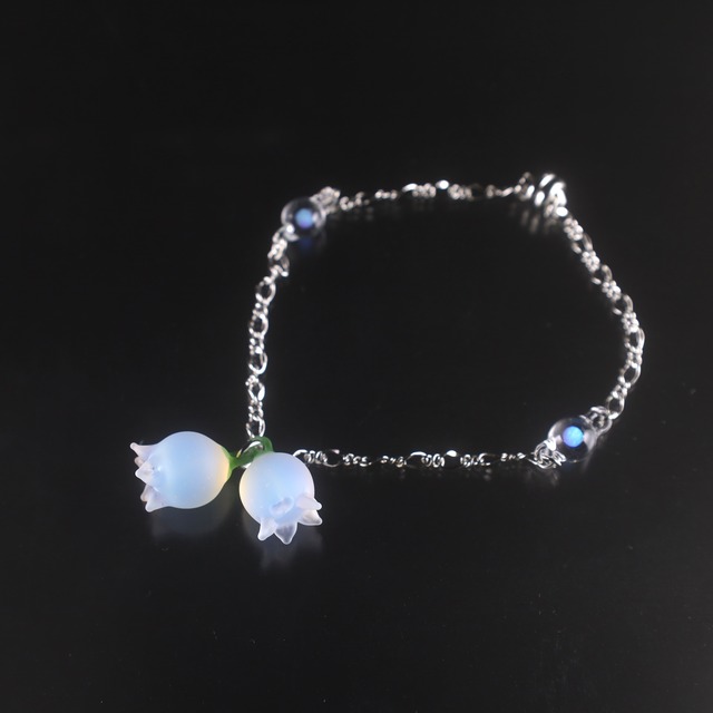 スズラン cocoroiro days 可愛らしいスズランの花のブレスレットになります。 サンドブラストをしているので、マットでふんわりした印象で日常使いにぴったりです。 花の色はゴースト。 オパリンのように乳白がかっており色合いが幻想的でとても綺麗になっております。 オパールをガラスに閉じ込めたパーツも一緒に組んでいるので、見る角度によってオパールの変化する色も楽しめます。 ブレスレット金具はマグネット式になっているので、身につけるのが比較的容易になっております。 枯れないスズランのブレスレット、ぜひお迎えよろしくお願いします。 スズランサイズ:W10 ×H18 ×D10 (mm) ブレスレット長さ:約18cm 直径:約5.5cm