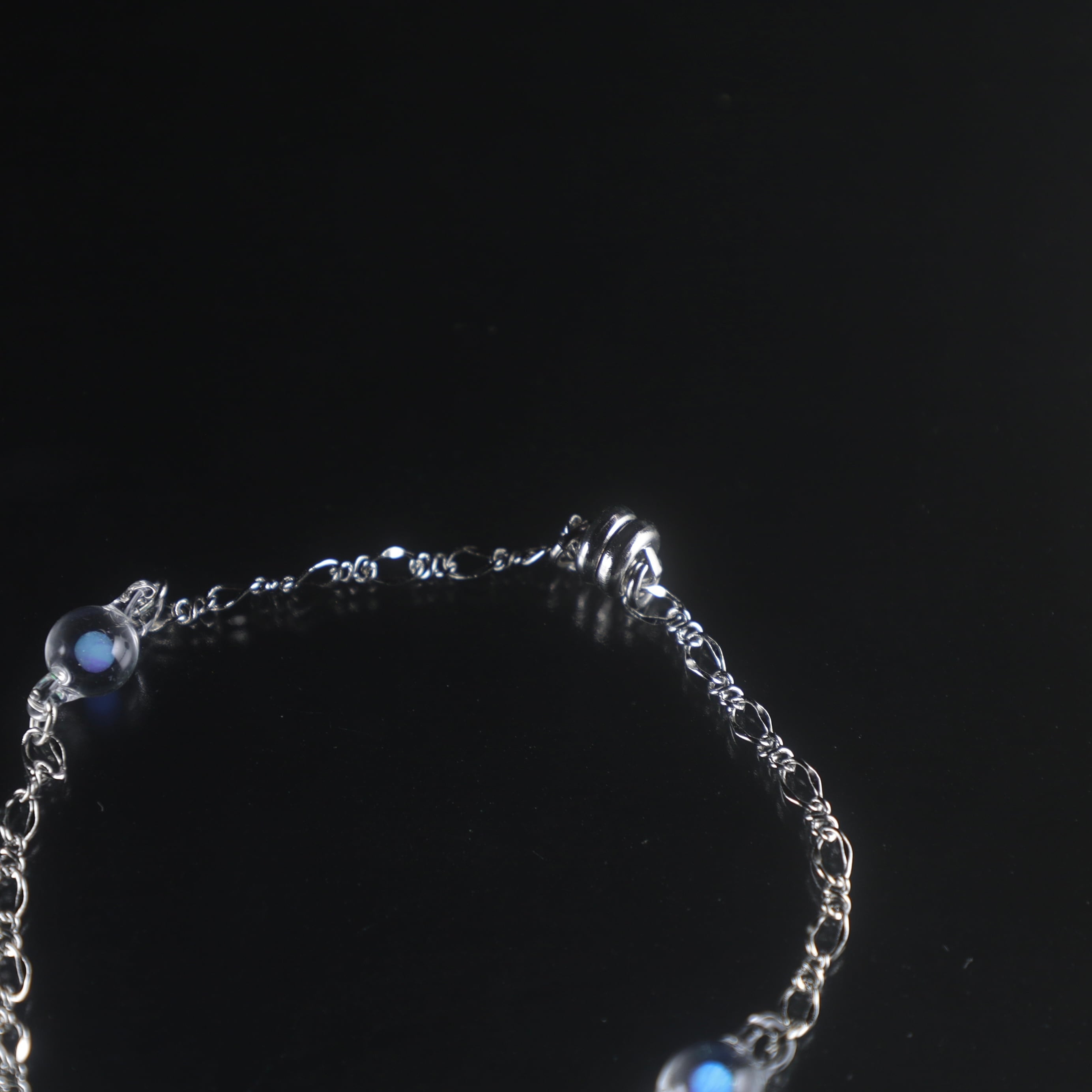 オパールをガラスに閉じ込めたパーツも一緒に組んでいるので、見る角度によってオパールの変化する色も楽しめます。