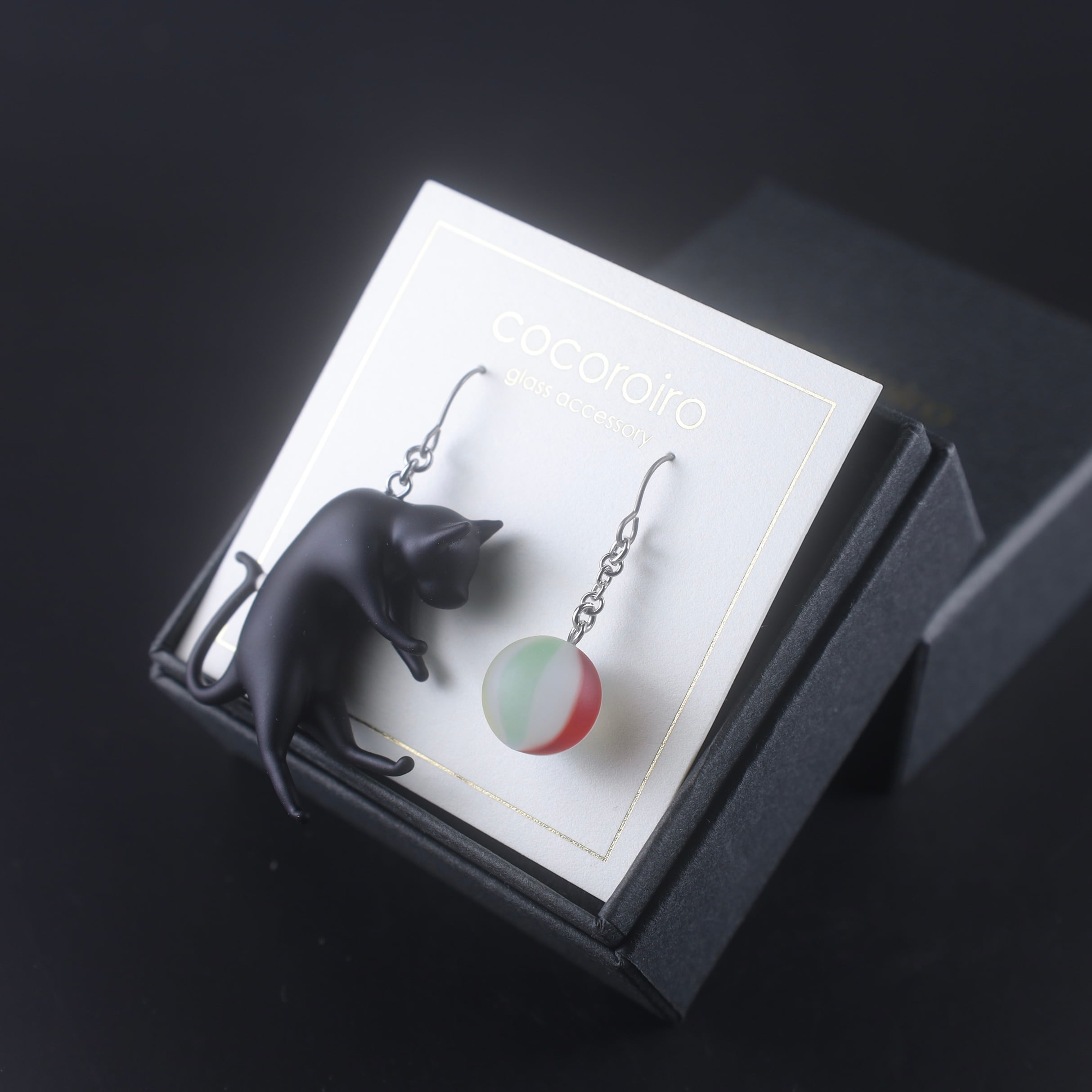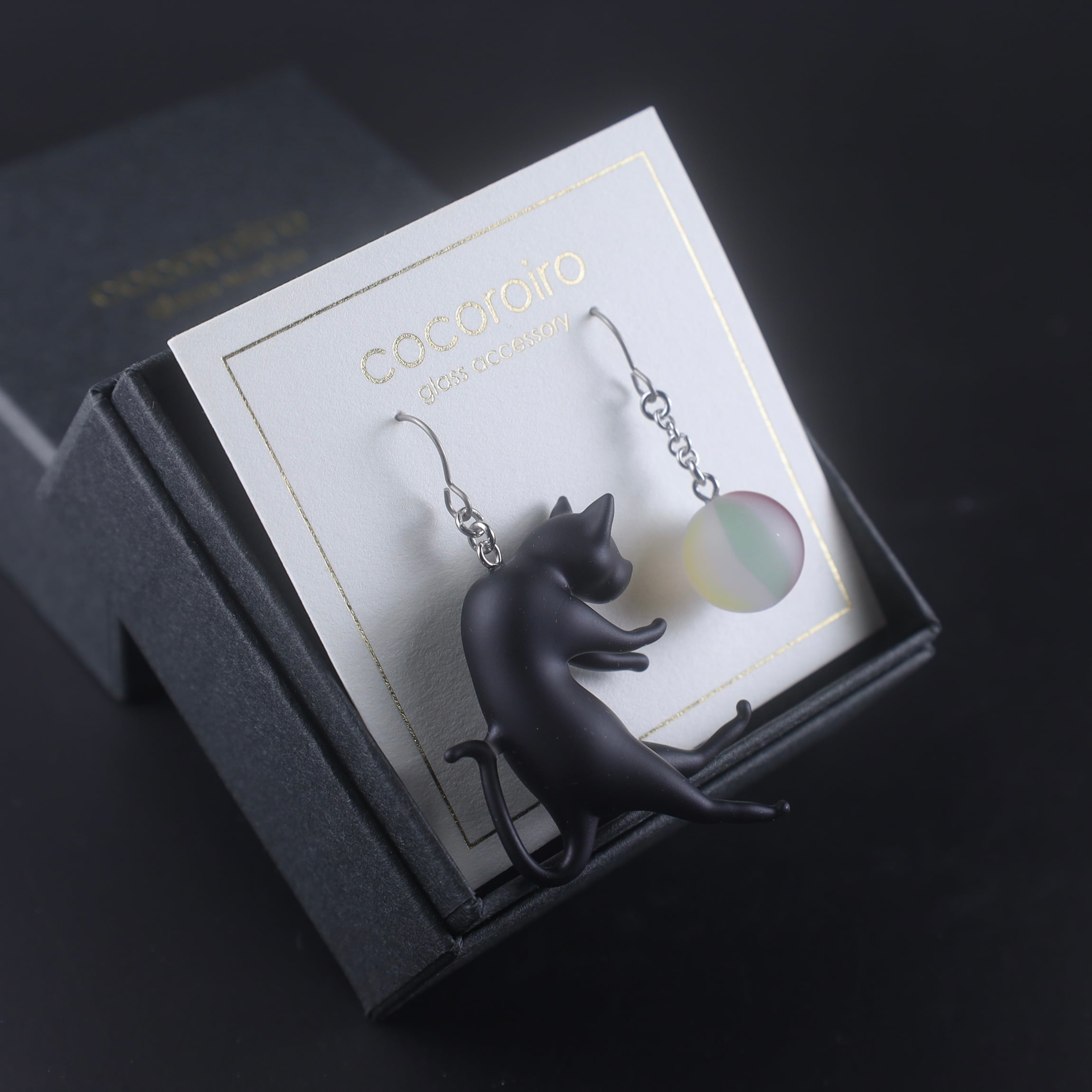 鞠にじゃれついて遊んでいるような黒猫のピアスになります。