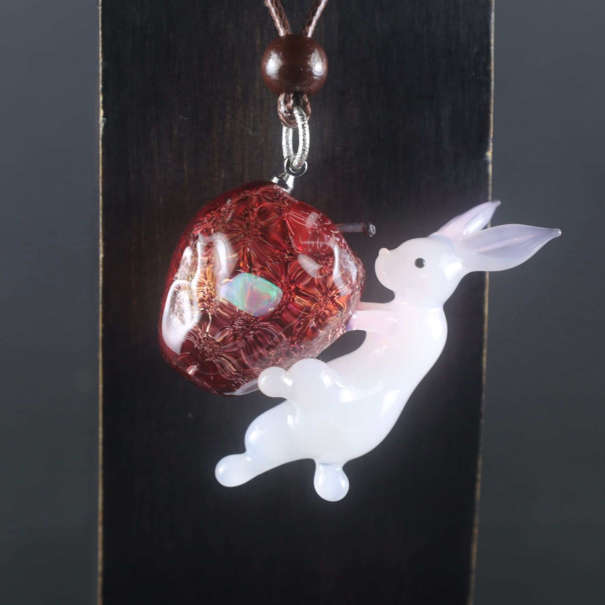リンゴのガラスの中には、ラフ型のレインボーオパールを閉じ込めており背面はダイクロガラス。