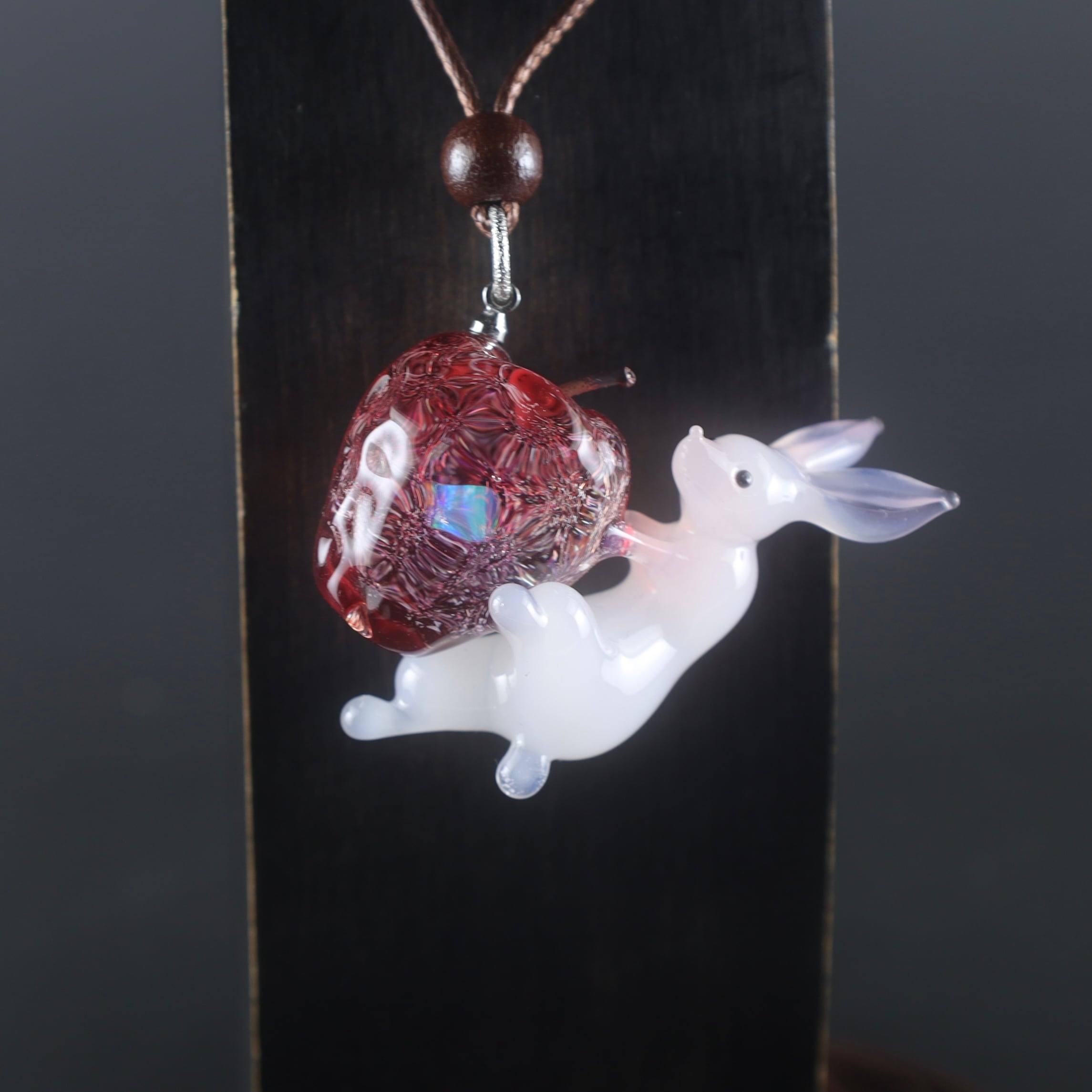 リンゴのガラスの中には、ラフ型のレインボーオパールを閉じ込めており背面はダイクロガラス。