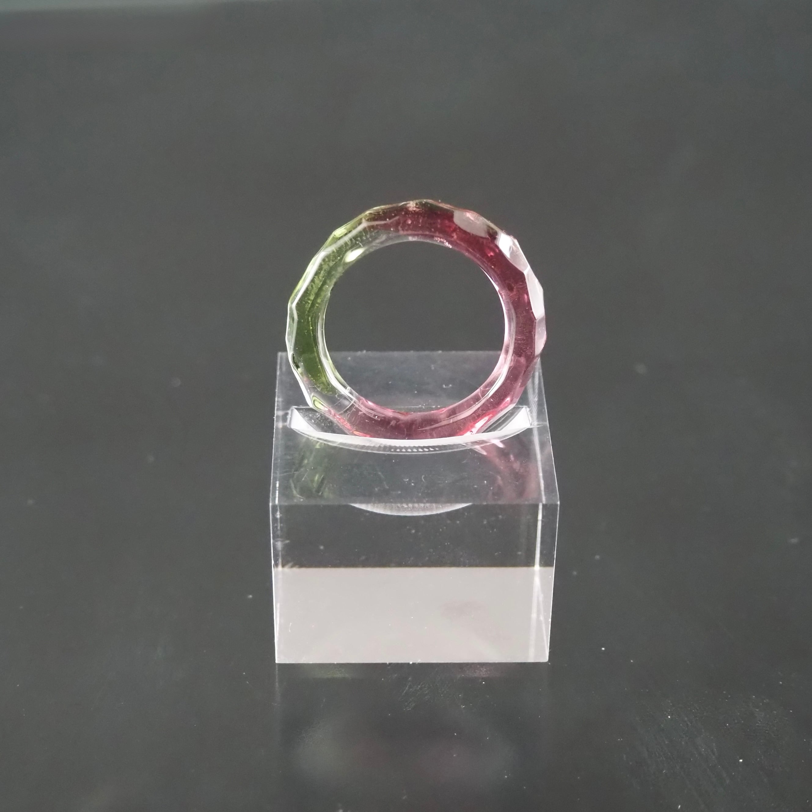 色を混ぜて繋いだガラスで指輪を制作し、カットをほどこしファイヤーポリッシュにて仕上げました。