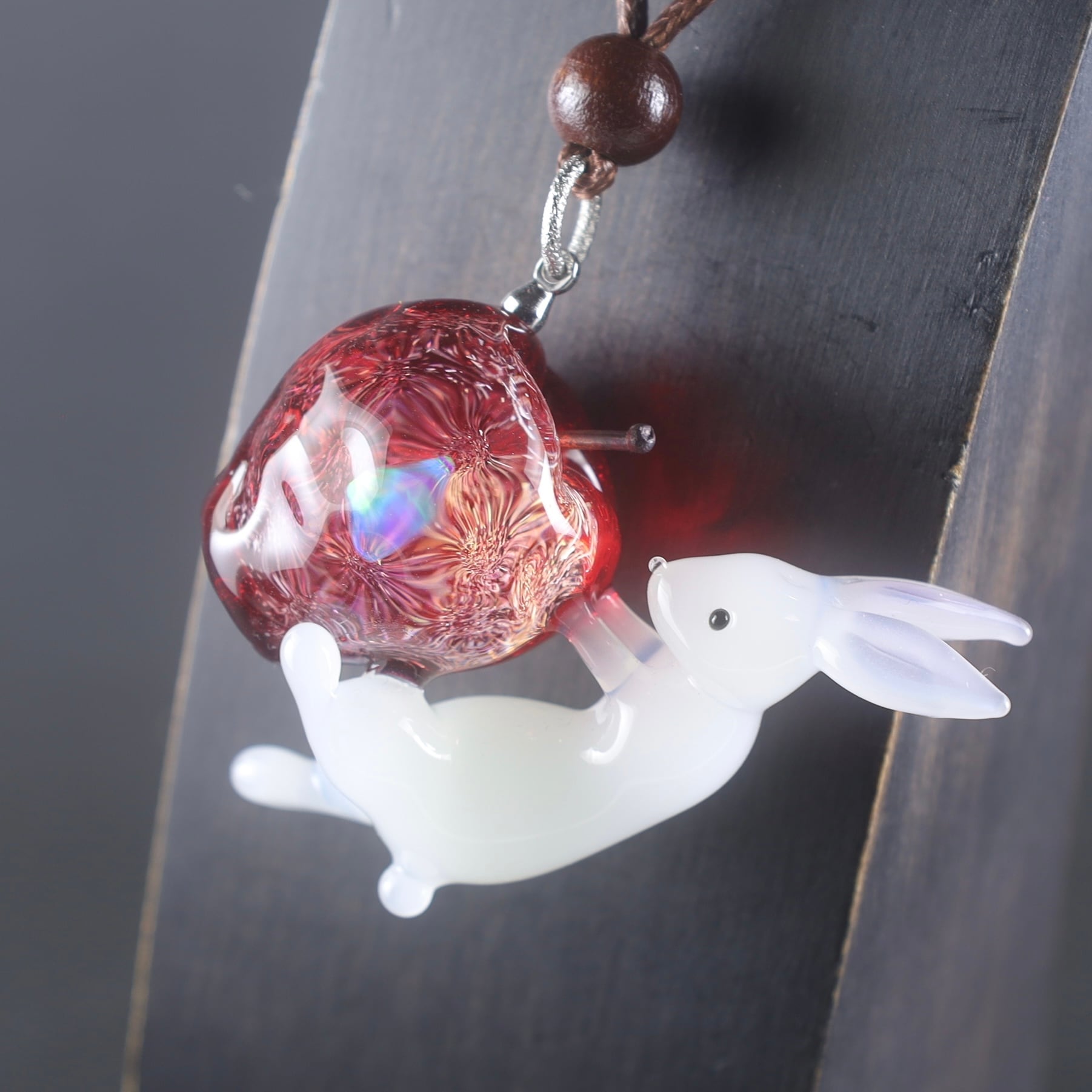 リンゴのガラスの中には、ラフ型のレインボーオパールを閉じ込めており背面はダイクロガラス。