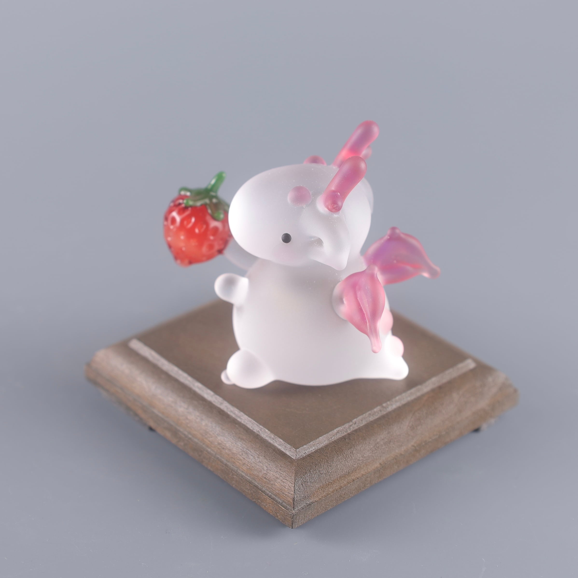 ふっくらしたフォルムに美味しい食べ物、今回はいちごを手に持っています。